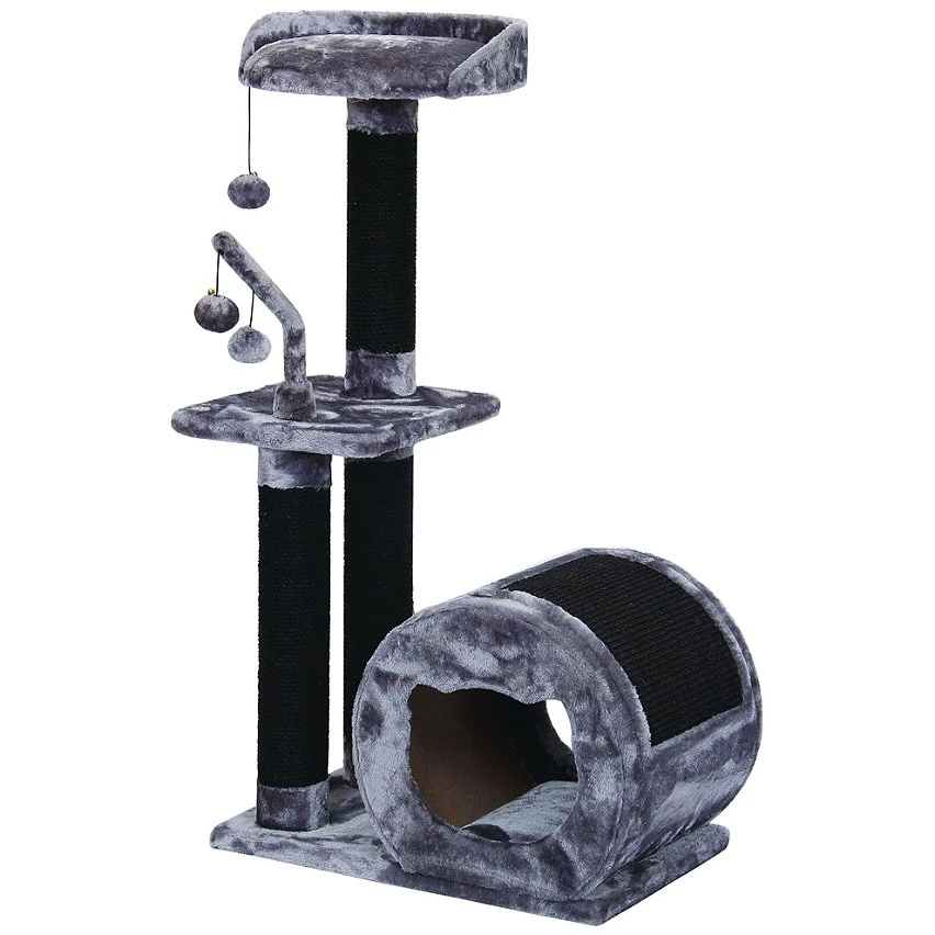 Découvrez ce bel arbre à chat noir et gris foncé.Grâce à ses nombreuse surfaces en sisal, votre chat pourra s’en donner à coeur joie pour faire ses griffes.Hauteur : 102,5cm Arbe à chat avec différents plateaux Accompagné de petites boules pour amuser votre chat. Tout doux, votre animal sera confortablement installé. Très solide et stable Cet arbre à chat ira parfaitement avec un intérieur moderne et fera le bonheur de votre ami à moustache. Plusieurs surfaces à griffer : poteaux et niche Votre chat pourra se reposer confortablement dans la niche Livré avec des jouets Dimensions : Hauteur : 102.5 cm Largeur : 35 cm Longueur : 55 cm