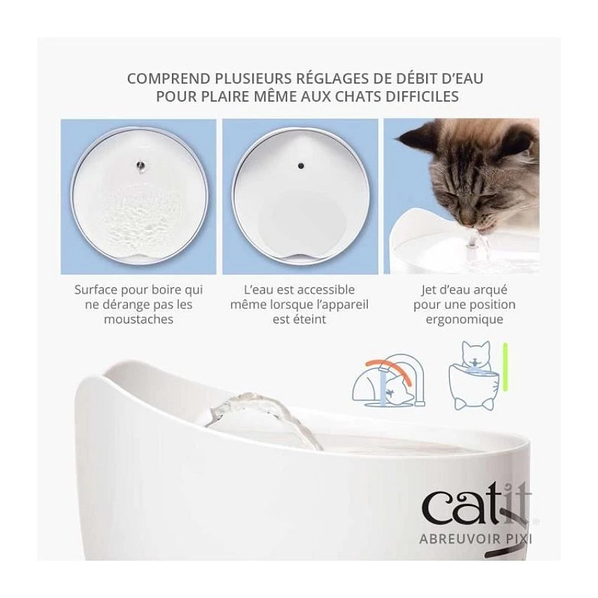 L’abreuvoir Catit PIXI offre a votre chat une source continue d’eau fraîche et pure. L’eau courante encourage les chats a boire davantage, ce qui aide a prévenir les maladies urinaires.