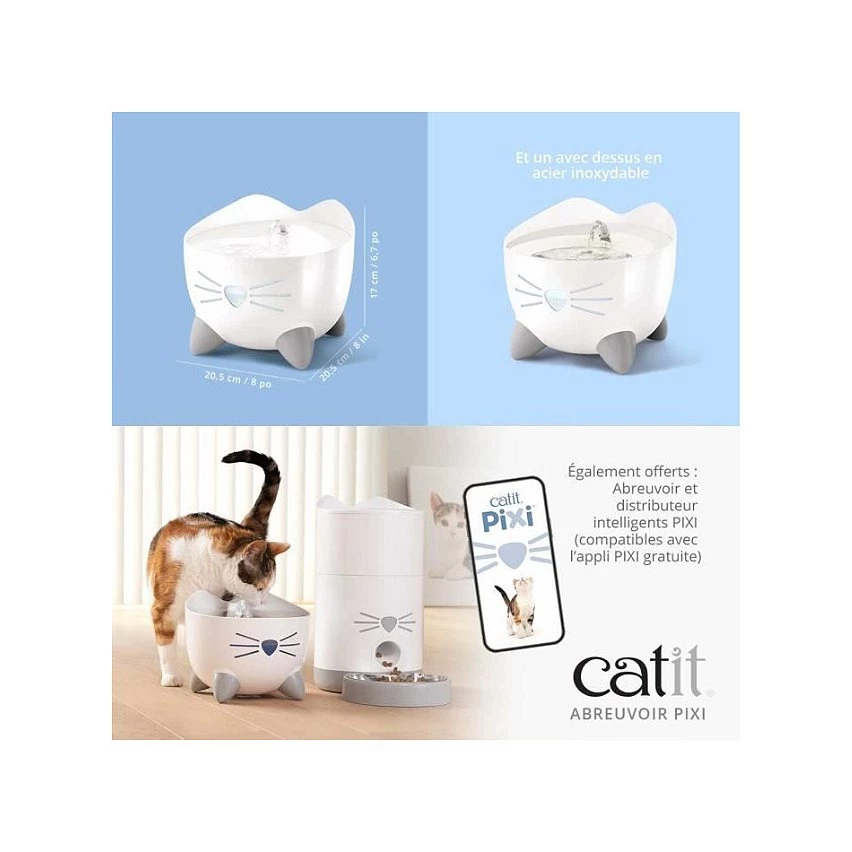 L’abreuvoir Catit PIXI offre a votre chat une source continue d’eau fraîche et pure. L’eau courante encourage les chats a boire davantage, ce qui aide a prévenir les maladies urinaires.