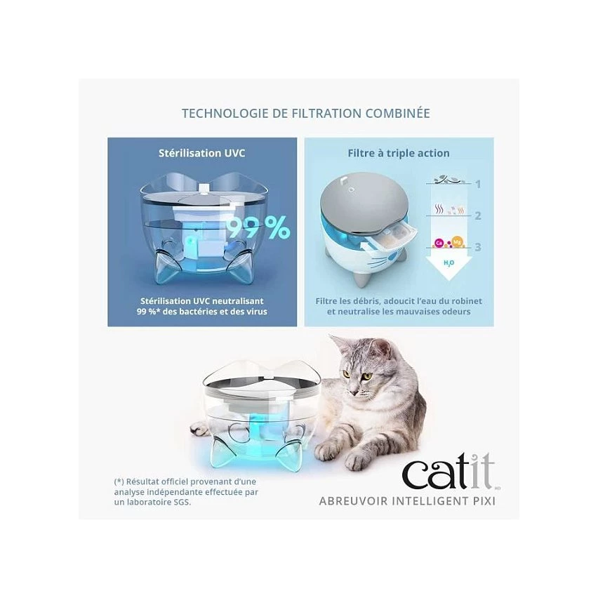 Les chats ont besoin d’un acces a de l’eau propre pour une bonne santé, puisqu’une hydratation adéquate peut aider a prévenir les troubles urinaires. L’abreuvoir intelligent Catit PIXI comprend deux technologies de filtration pour une eau ultra propre et bonne au goût.