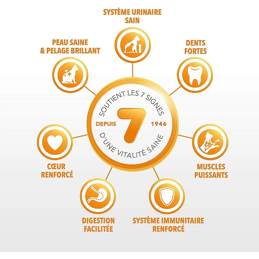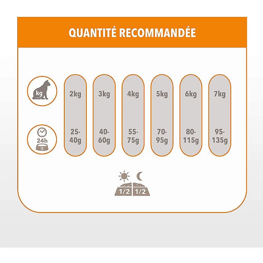 protéines 35 %, teneur en matières grasses 14 %, acides gras oméga-6 2,6 %, acides gras oméga-3 0,27 %, cendres brutes 7,2 %, cellulose brute 1,7 %, calcium 1,4 %, phosphore 1,2 %, magnésium 0,089 %, taurine 2 000 mg/kg.