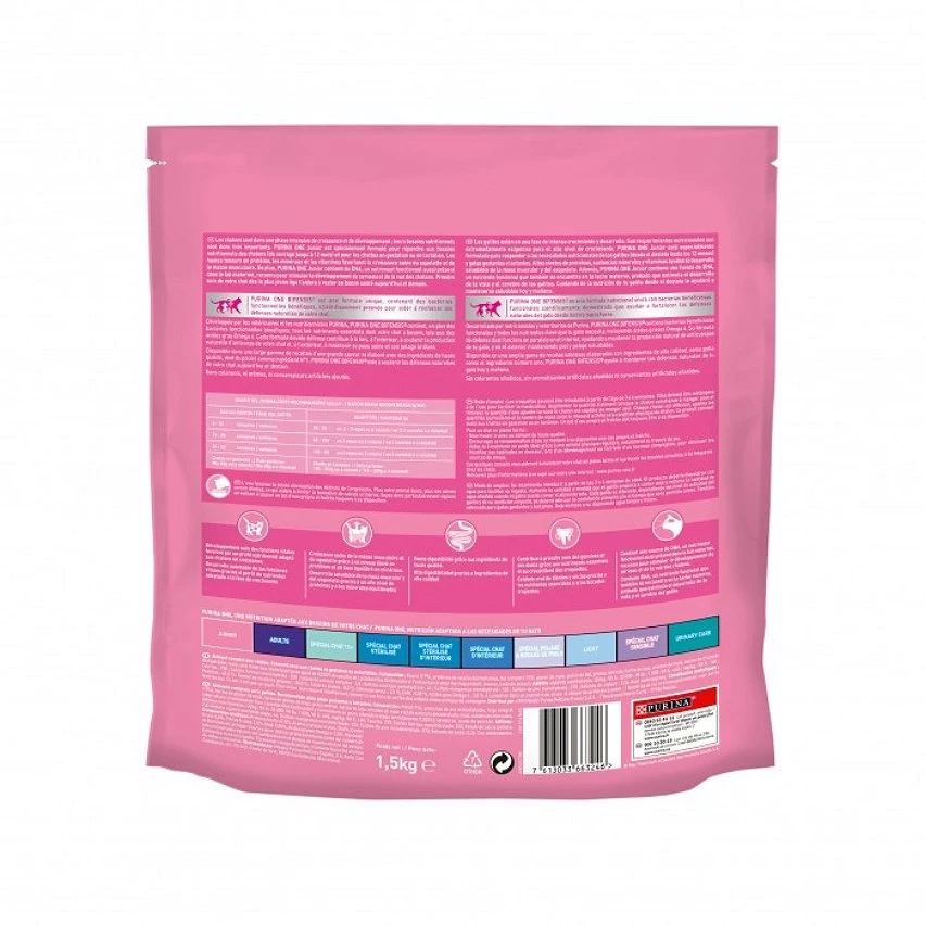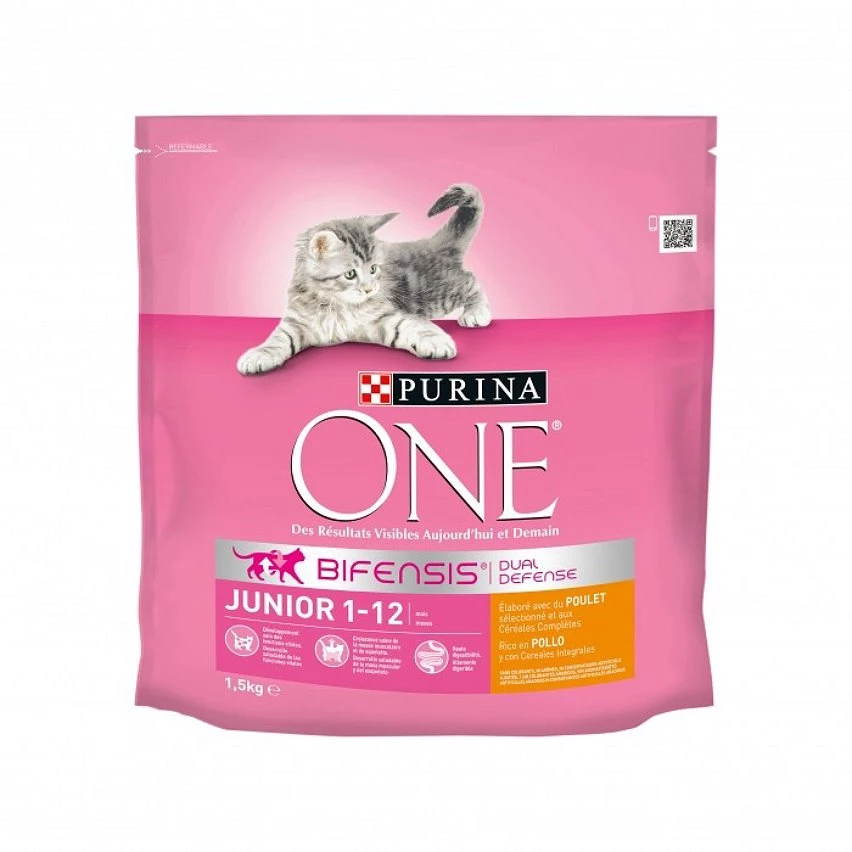 PURINA ONE® Junior est spécialement formulé pour répondre aux besoins nutritionnels des chatons (du sevrage jusqu?à 12 mois) et pour les chattes en gestation ou en lactation.