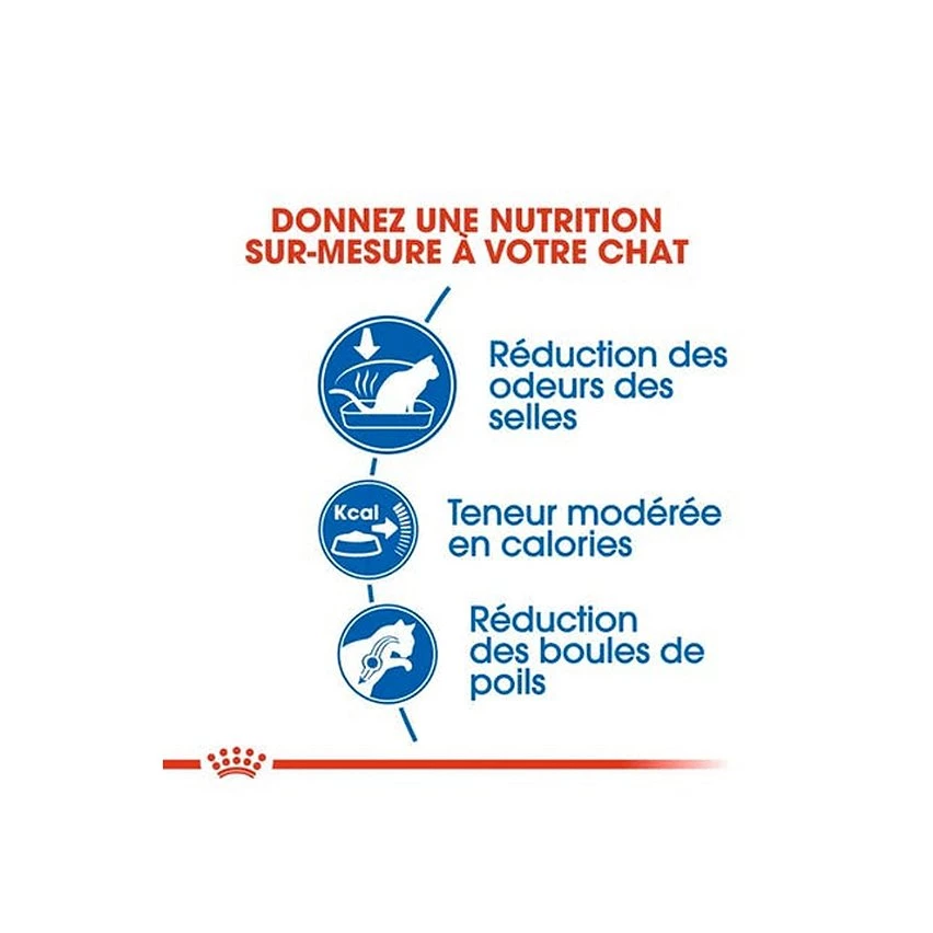 Votre chat d’intérieur a besoin d’une alimentation spécifique équilibrée et complète.C’est pourquoi Royal Canin a créé les croquettes Indoor 27 qui répondent à tous les besoins d’un chat adulte qui sort peu. Croquettes Royal Canin Indoor 27 pour chat adulte d’intérieur Grâce à des protéines hautement digestibles et une teneur ajustée en fibres et des nutriments spécifiques , votre chat bénéficiera d’une meilleure digestion. Réduction du volume et de l’odeur des selles Faible teneur en calories pour maintenir un poids idéal Réduction des boules de poils, grâce à l’action notamment du psyllium et des fibres spécifiques contenues dans les croquettes Contribue à la bonne santé du système urinaire en réduisant la formation de calcul urinaire. Recommandées pour des chats de 1 à 7 ans