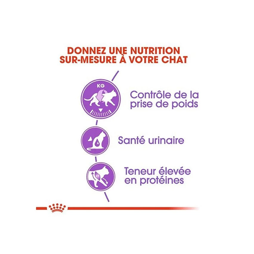 Après une stérilisation ou une castration, votre chat a des besoins énergétiques différents.Les croquettes Royal Canin Sterilised 37, vont permettre à votre chat de se maintenir en forme tout en contrôlant sa prise de poids. Croquettes Royal Canin Sterilised 37 pour chats adultes castrés ou stérilisés Croquettes élaborées pour limiter la prise de poids du chat suite à sa stérilisation Teneur faible en matières grasses Favorise la bonne santé urinaire de votre chat et permet d’éviter la formation de calculs urinaires grâce à un apport adapté en minéraux La teneur élevée en protéines permettra à votre chat de maintenir sa masse musculaire Enrichi en L-Carnitine qui contribue au métabolisme des graisses Croquettes appétentes Recommandé pour des chats de 1 à 7 ans Pour les chats gourmands, retrouvez les croquettes Royal Canin Sterilised Appetite Control.