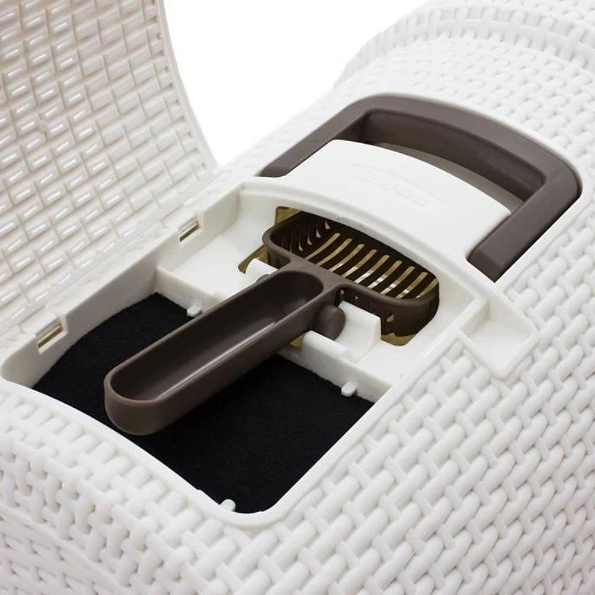 Maison de toilette – Bac extensible – Equipée d’une pelle et d’un compartiment sur le dessus pour ranger cette pelle – Style rotin – Poignée pour faciliter le déplacement – Coloris : blanc ivoire – Pour chat.