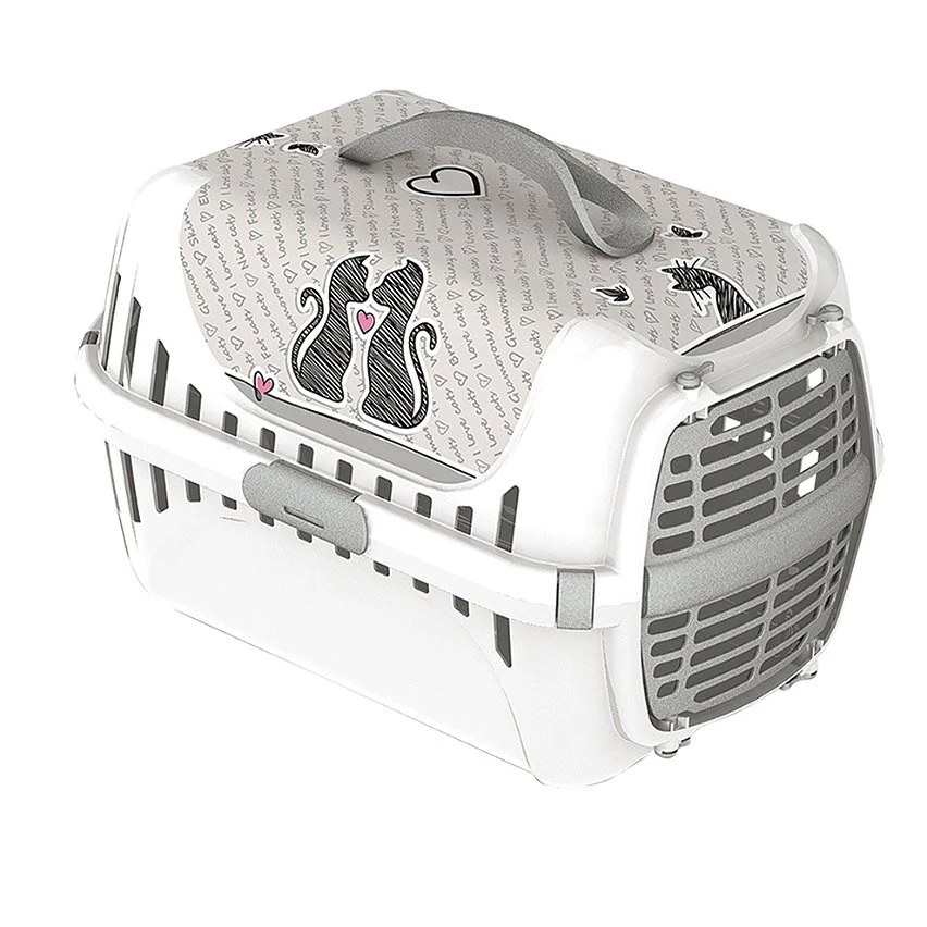 La caisse de transport pour chat “Cats In Love” est résistante, élégante et discrète. En voiture, bus ou train, transportez votre chat ou votre chaton de façon confortable et sécurisée. Magnifique caisse de transport pour chat “Cats In Love” avec motifs romantiques. Ce panier de transport permettra à votre chat de voyager en toute sécurité que ce soit en voiture , bus ou train . Sa poignée en caoutchouc vous apportera plus de confort lors de vos trajets à pieds. Ce Pet Voyageur est design et fonctionnel grâce à sa porte plastique qui permet une ouverture à droite ou à gauche . Dimensions : Longueur : 51 cm – Largeur : 31 cm – Hauteur : 34 cm Caractéristiques et Avantages : Caisse de transport pour chat Cats In Love Matière : plastique Sérigraphie incrustée dans la masse Protection anti UV Ne s’altère pas au lavage Poignée en caoutchouc confortable Porte en plastique qui permet une ouverte à droite comme à gauche. Très bonne aération grâce à ses larges ouvertures sur les côtés Pour des chats de 7 kgs maximum Nous vous proposons les gamelles, le distributeur, le bac à litière ainsi que la maison de toilette pour compléter cette très belle collection Cat’s In Love.