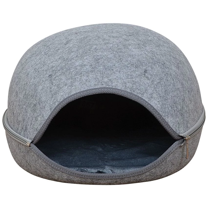 Corbeille pour chat en feutrine, doté d?un coussin amovible lavable en machine à 30°C. Elle s?assemble facilement et rapidement grâce à sa fermeture éclair qui lui permet aussi d?être stockée aisément. Peut également servir de corbeille classique. Caractéristiques et avantages : Ce petit refuge peut aussi servir de corbeille classique grâce à son dôme amovible. Forme ovale et compacte adaptée au sommeil des chats Feutrine douce et légère Coussin confortable et lavable en machine Dimensions : 47 x 41 x 31 cm