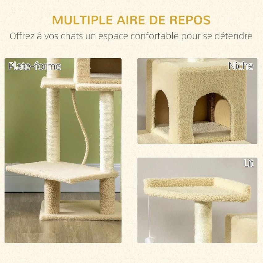 – Arbre à chat centre d’activités variées : griffoirs, grande niche, 3 plateformes, jeux suspendus, corde d’escalade permettant à votre chat de jouer, faire ses griffes et de s’étirer