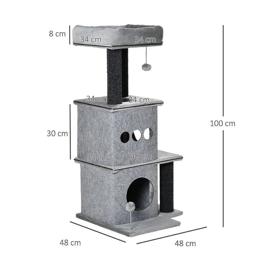 – Multi-équipement : 2 grandes niches avec housses amovibles, 4 plateformes dont une grande et haute d’observation, jeu de boule suspendue et boule à ressort, griffoirs