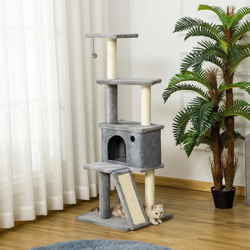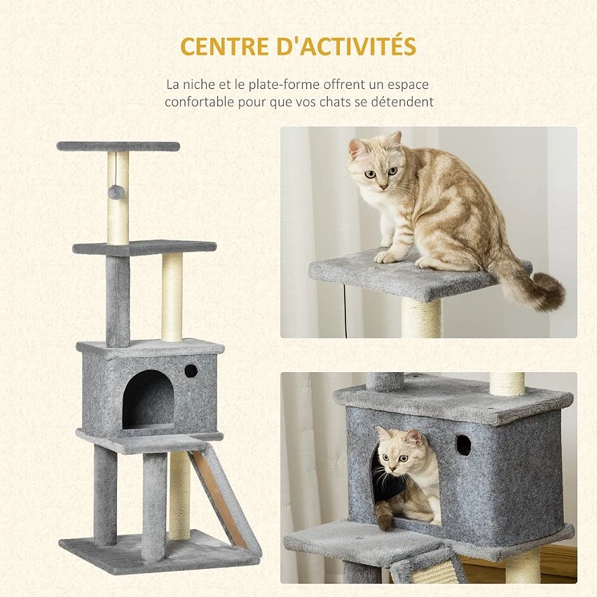 Votre boule de poils pourra s’amuser tous les jours avec cet arbre à chat centre d’activités multi-équipé. Multi-niveaux, doté de nombreux équipements (griffoirs, grattoir, grande niche avec housse amovible, jeu de boule suspendue) et plusieurs plateformes, votre chat pourra se dépenser, se reposer ou faire ses griffes sans avoir à s’attaquer à vos meubles.