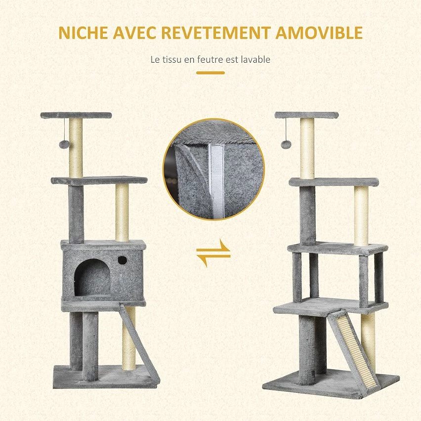 – Multi-équipement : grande niche avec housse amovible, 4 plateformes dont une haute d’observation, grattoir, griffoirs, jouet boule suspendue
