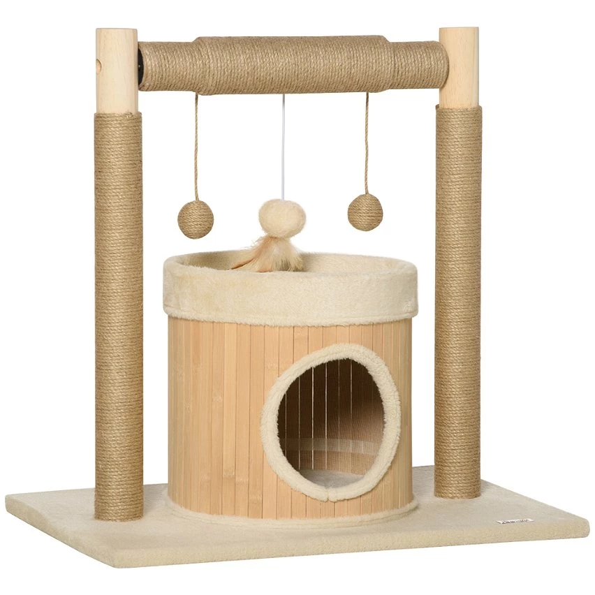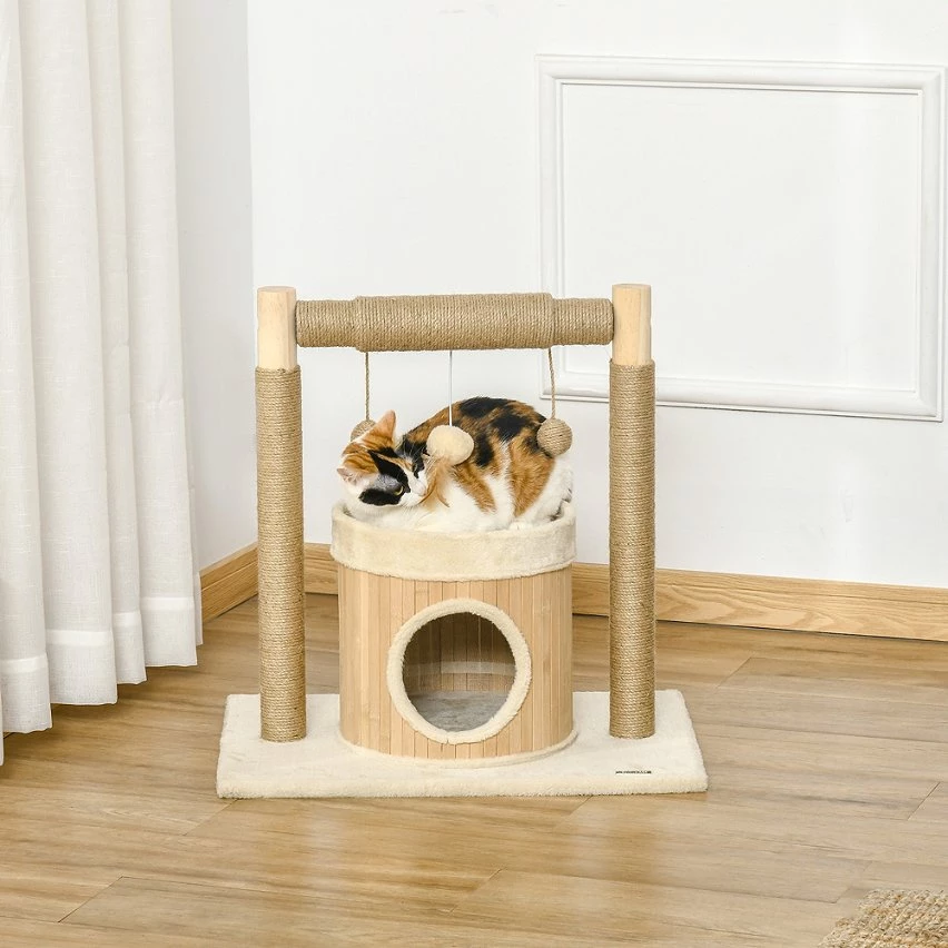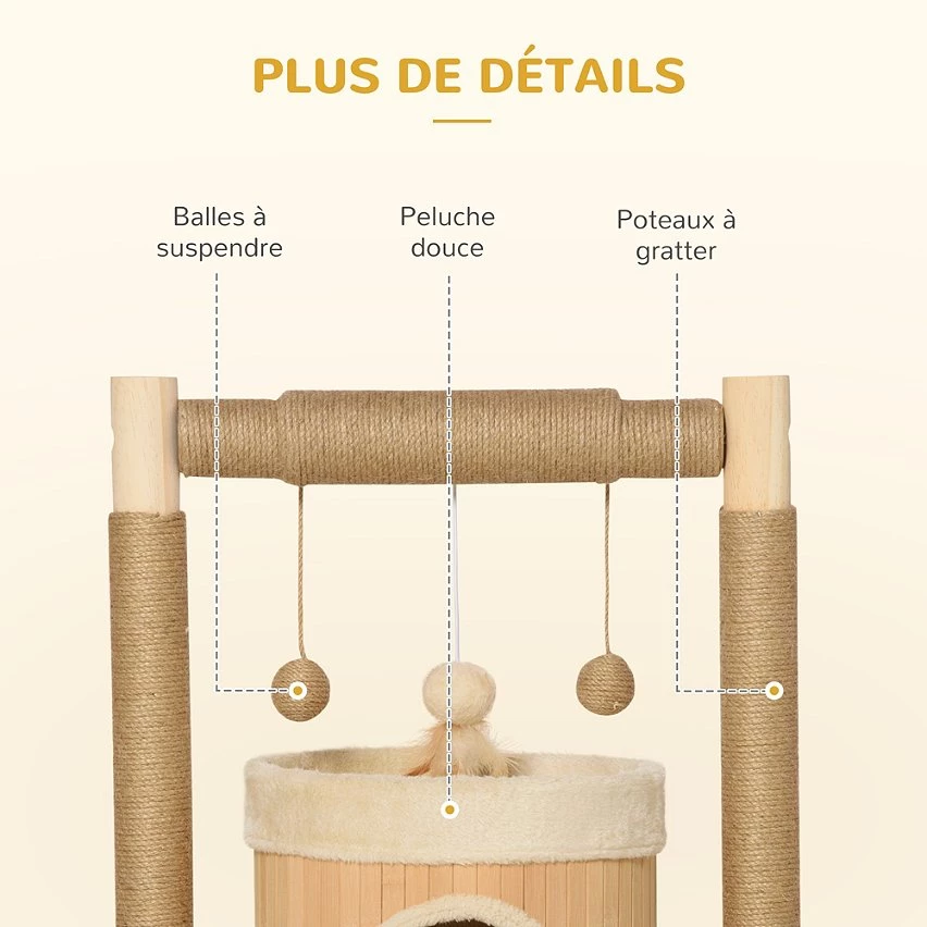 Ce joli modèle d’arbre à chat PawHut est équipé de 3 griffoirs, une niche ronde, trois boules suspendues et 1 plateforme qui ne manqueront pas d’éveiller et d’amuser votre chat ! La plateforme d’observation est recouverte de flanelle douce et confortable. Sa taille compacte est parfaite pour les petits espaces.