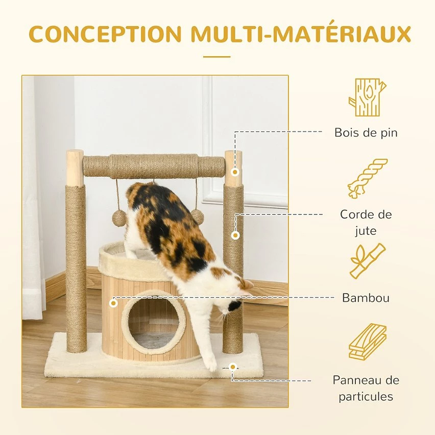 – Matériaux principaux : panneau de particules, bois de pin, bambou, jute, peluche