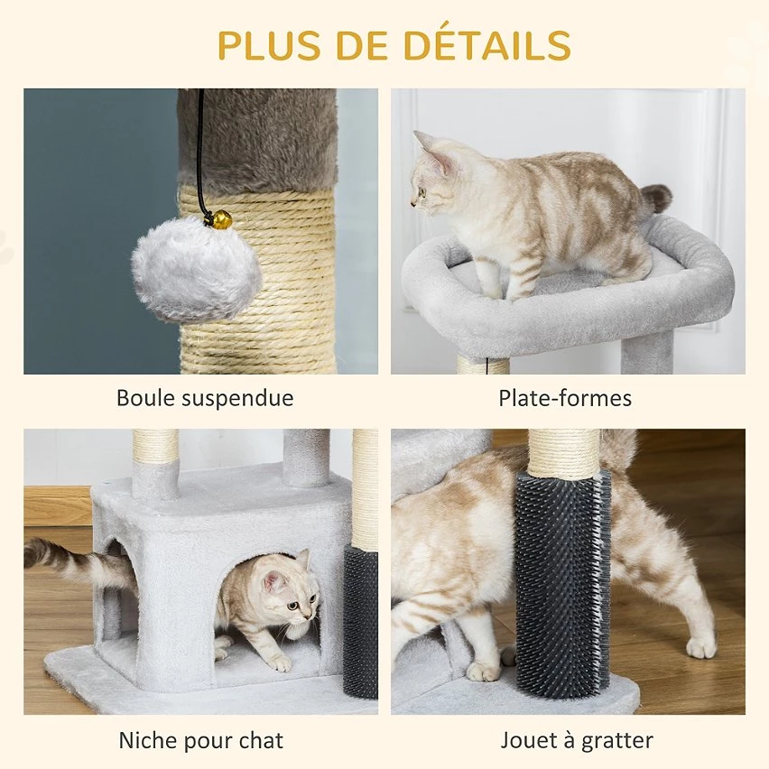 – Arbre à chat centre d’activités variées : 2 griffoirs (dont un doté d’une bande massante), grande niche, panier d’observation, plateforme, jeu de boule suspendue permettant à votre chat de jouer, faire ses griffes et de s’étirer