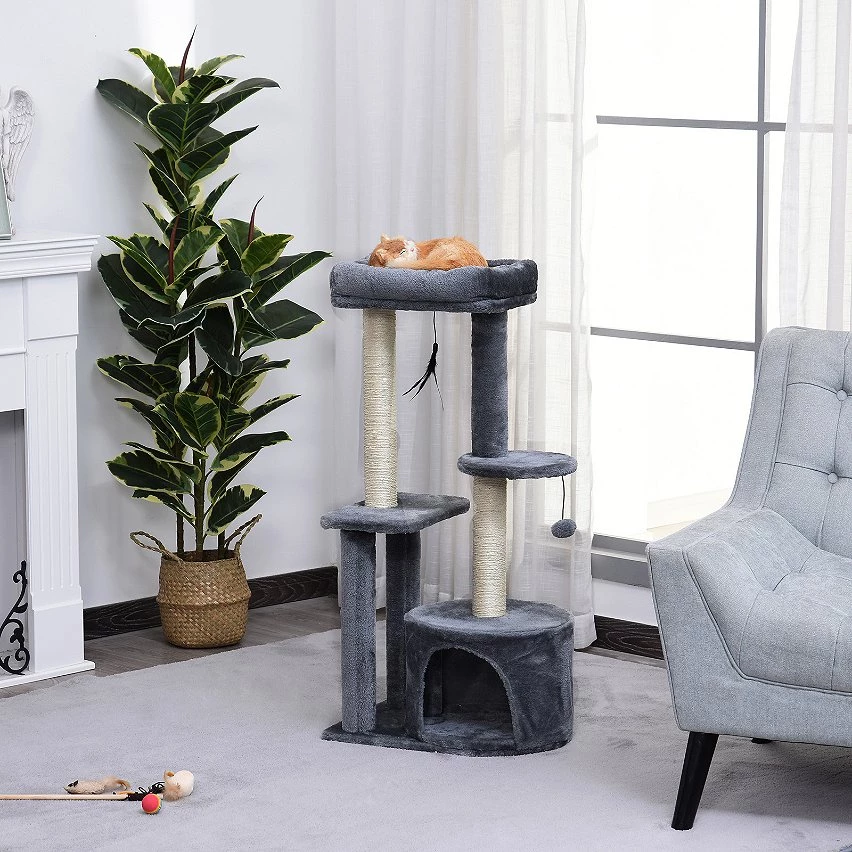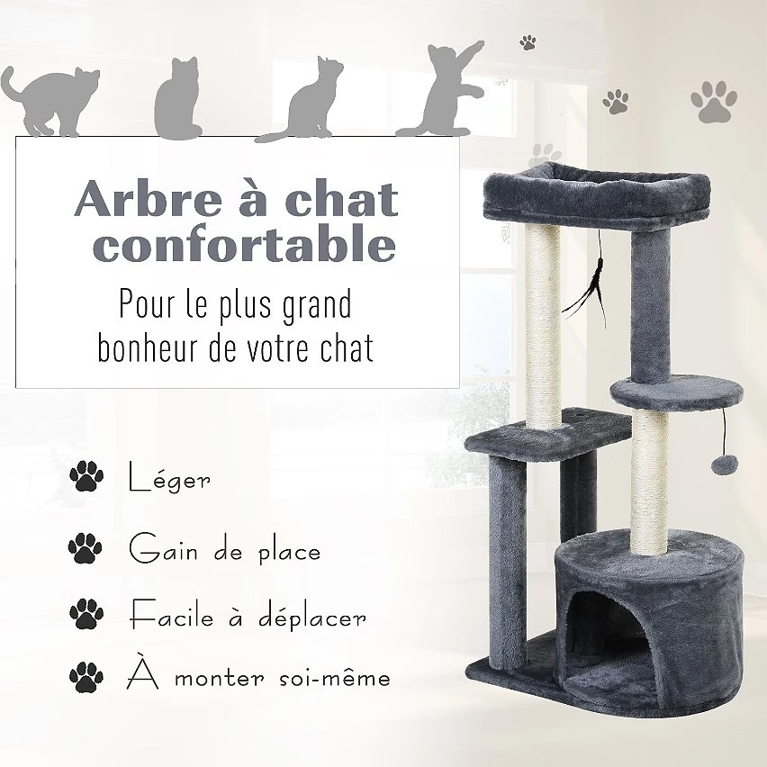 – Arbre à chat centre d’activités variées : griffoirs, grattoirs, niche, plateformes et 2 jouets suspendus (boule & plumes) permettant à votre chat de jouer, faire ses griffes et de s’étirer
