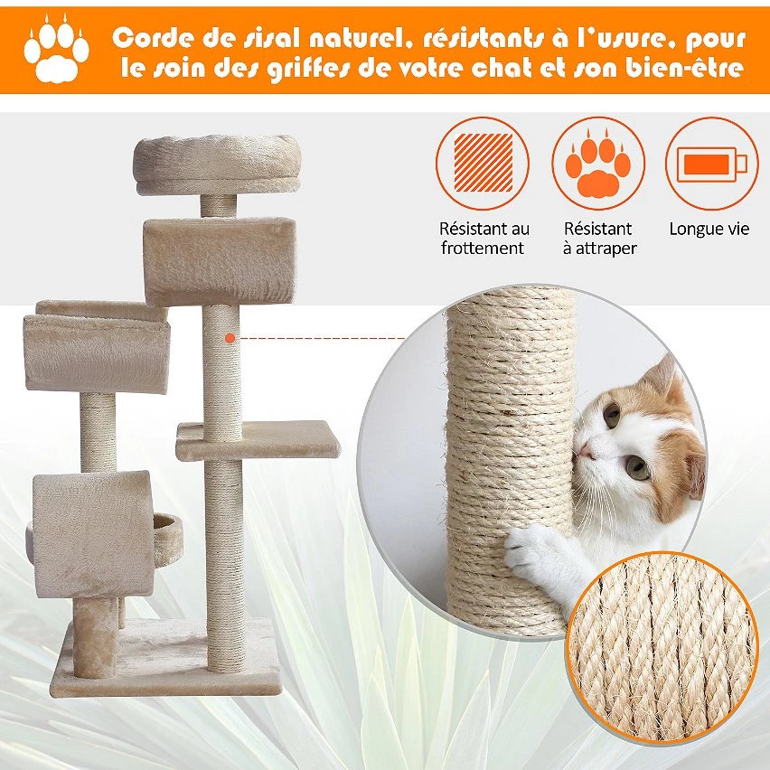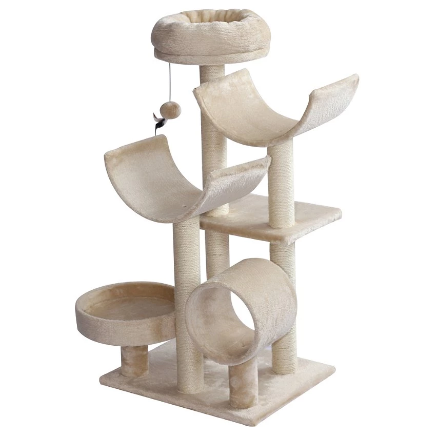 – Equipements multiples : plate-formes (x5), griffoirs, grattoirs, tunnel et jouet suspendu