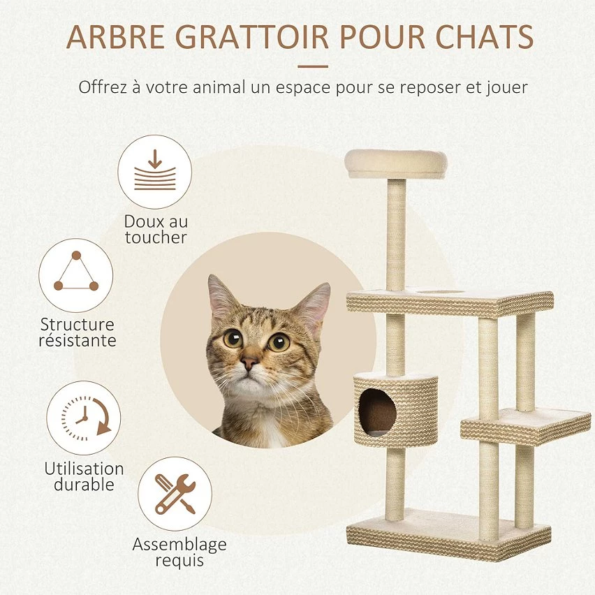 Ce magnifique arbre à chats style cosy chic bicolore beige café apportera une touche d’originalité et d’élégance supplémentaire à votre intérieur. Doté de griffoirs, d’une niche, de plusieurs plateformes dont une d’observation avec rebord, votre chaton ou chat pourra se développer et s’épanouir pleinement !