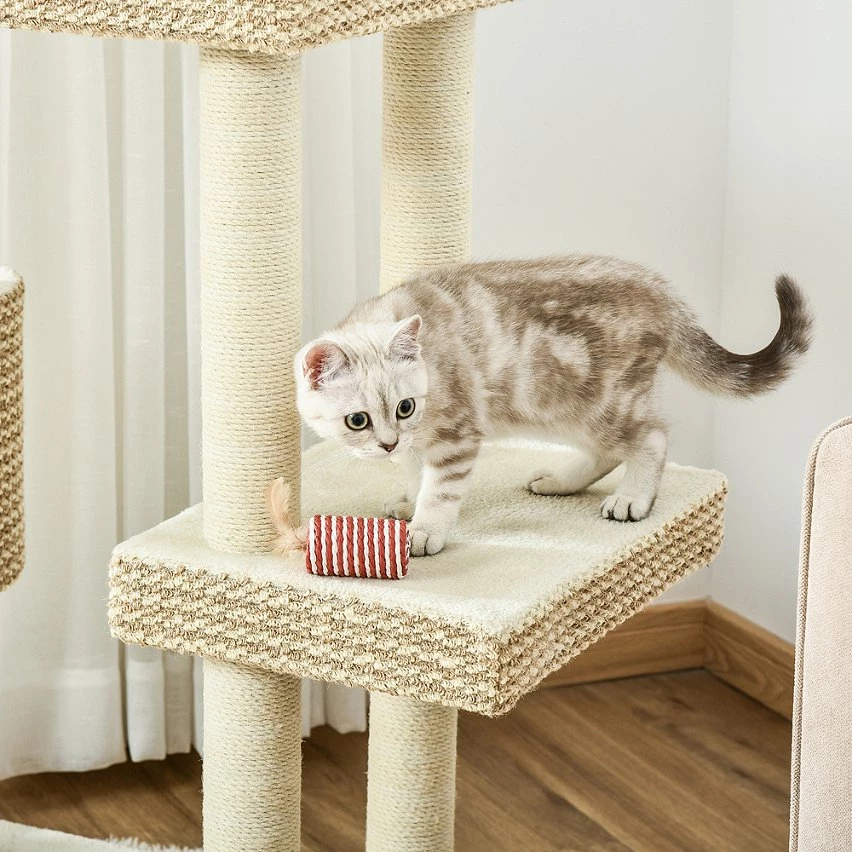 – Arbre à chat centre d’activités variées : griffoirs, niche, plusieurs plateformes dont une d’observation avec rebord permettant à votre chat de jouer, faire ses griffes et de s’étirer