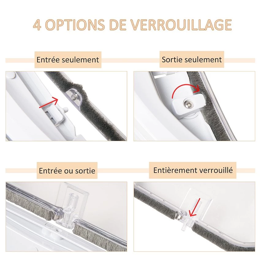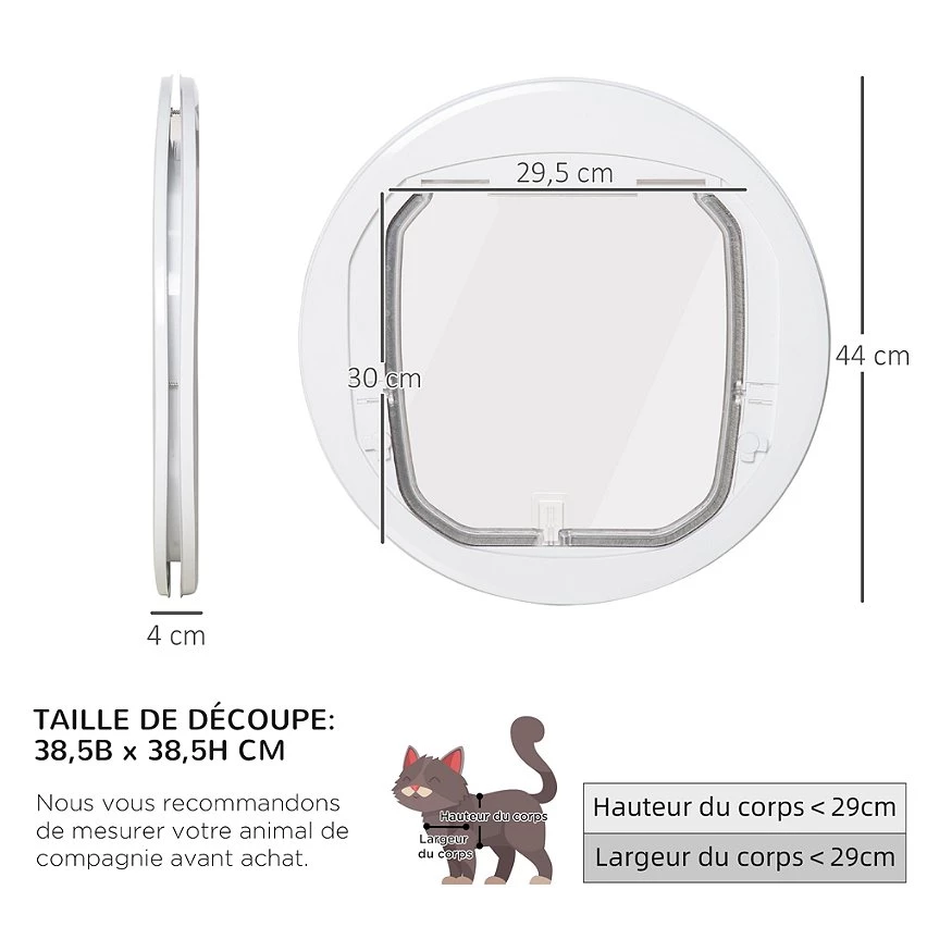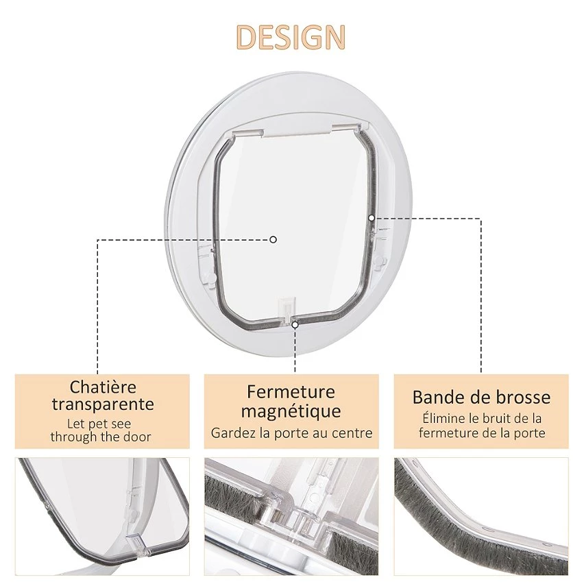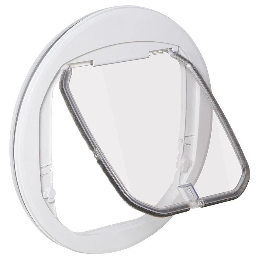 – Jolie chatière de forme ronde en polycarbonate blanc avec battant transparent : permet au chat de voir au travers