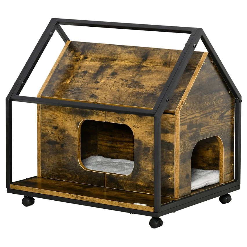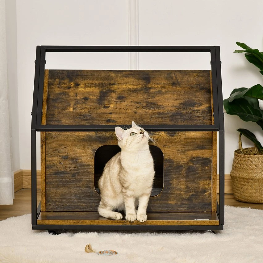 – Maisonnette chat design industriel mélant avec élégance le métal (châssis) et le bois (maison, terrasse en panneaux de particules aspect bois vieilli avec veinage)