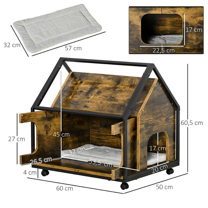 – Niche chat sur roulettes dont 2 sont équipées de freins : mobilité et stabilité optimums