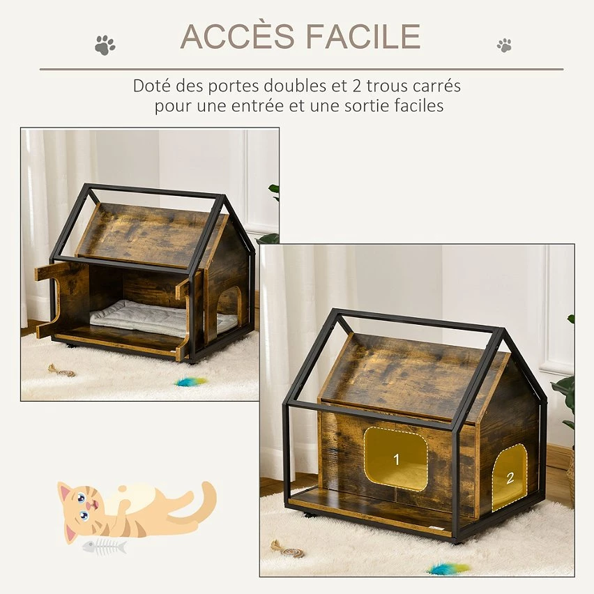 – Maison pour chat dotée d’une double porte ouvrable et d’une sortie