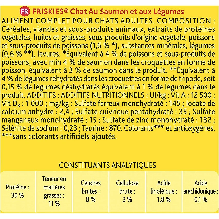 Croquette FRISKIES chat Adulte Saumon Légumes 2kg. Croquette FRISKIES chat Adulte Saumon Légumes de délicieuses croquettes de qualité, soigneusement élaborées pour nourrir l’insatiable appétit de découverte de votre chat..