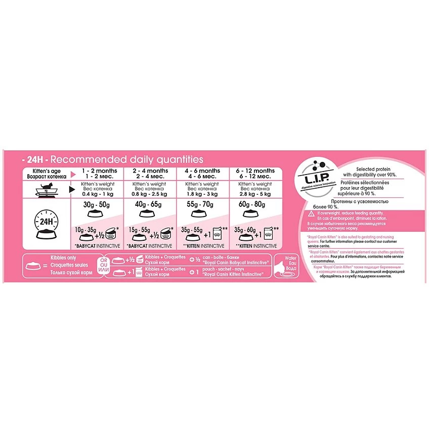 | Condition d'utilisation | Quantité journalière recommandée : Chaton de 1 à 2 mois – Poids : 400g et 1kg : 30g à 50g Chaton de 2 à 4 mois – Poids : 800g et 2,5kg : 40g à 65g Chaton de 4 à 6 mois – Poids : 1,8kg et 3kg : 55g à 70g Chaton de 6 à 12 mois- Poids : 2.8kg et 5kg : 60g à 80g |