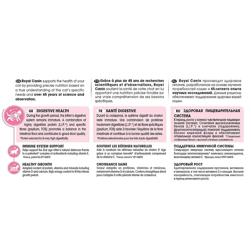 Les croquettes Royal Canin Kitten 2ème âge sont recommandées pour des chatons de 4 à 12 mois.Elles sont également conseillées pour la chatte en gestation ou lactation.Plusieurs conditionnements. Croquettes Royal Canin Kitten pour chaton 2ème age : de 4 à 12 mois Idéales aussi pour les chattes en gestation ou lactation Formule étudiée pour répondre aux besoins spécifiques des chatons. Taille de croquettes idéales et facile à macher. Protéines hautement digestibles Teneur adaptée en protéines, vitamines et minéraux Les croquettes Royal Canin soutiennent la santé de votre chaton en lui apportant une nutrition précise fondée sur ses besoins. Santé digestive : La combinaison de protéines hautement digestibles et de fibres specifiques telle que le psyllium, aide à favoriser l’équilibre de la flore instestinals et contribue à la bonne qualité des selles Soutient les défenses naturelles : Ces croquettes aident votre cahton à construire ses défenses naturelles grâce à un complexe vreveté d’aintoxydants comprenant de la vitamine E Croissance saine : La teneur adaptée en protéines, vitamines et mnéraux sont essentiels pour s’adapter à cette période de croissance intense 3 conditionnements : 2Kg 4Kg 10Kg