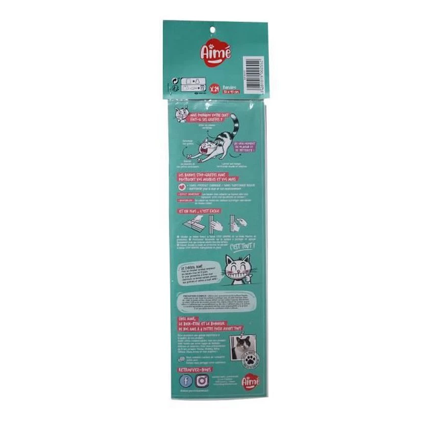 Stop griffe adhésif avec 24 bandes autocollantes – Permet d’apprendre a votre chat a ne pas faire ses griffes n’importe où – Aucune substance nocive ni pour votre chat ni pour l’environnement – Facile a utiliser sur vos canapés, vos meubles, vos tissus et vos rideaux – Vous pouvez changer ces bandes tous les 10 jours.