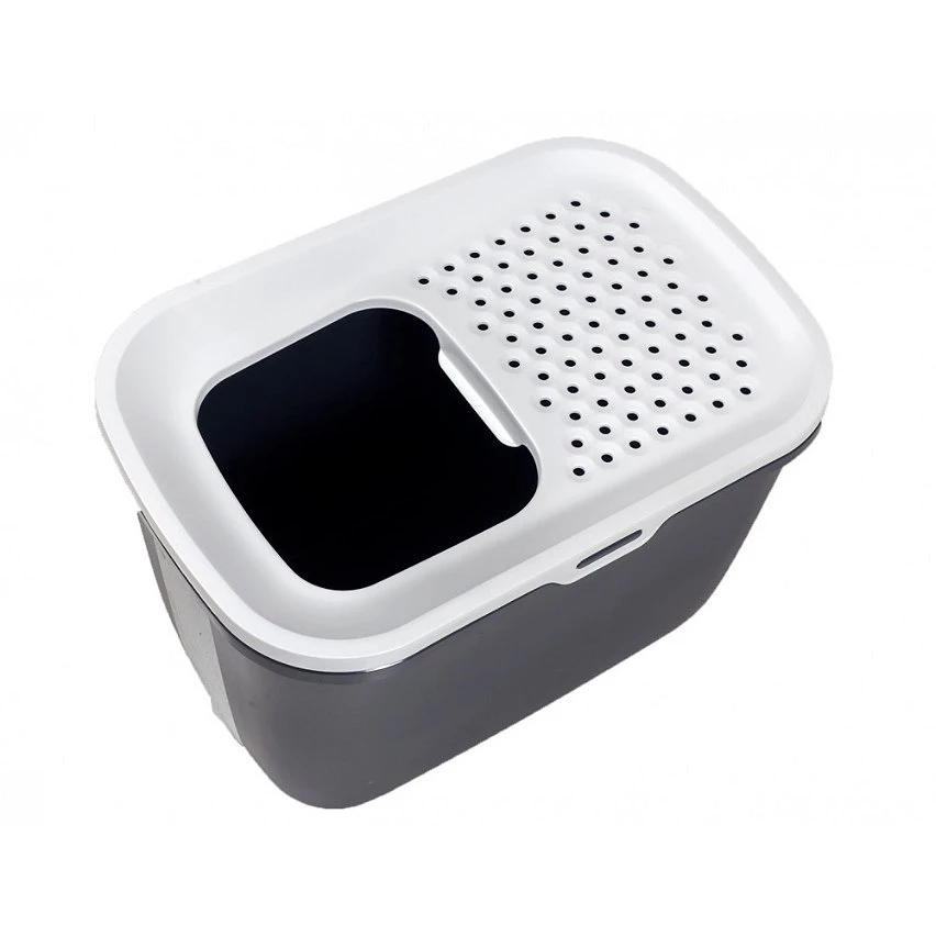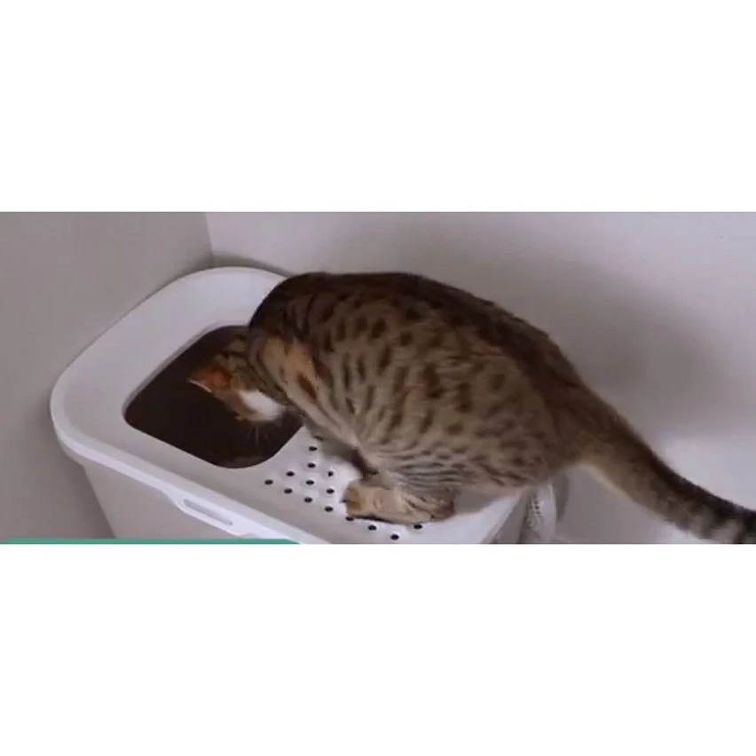 La caractéristique la plus importante du Hop In est le couvercle perforé légèrement incliné. En traversant le couvercle en quittant le plateau, la litière pour chat tombe à travers les petits trous à l’intérieur. Par conséquent, la zone autour du plateau reste propre et bien rangée.
