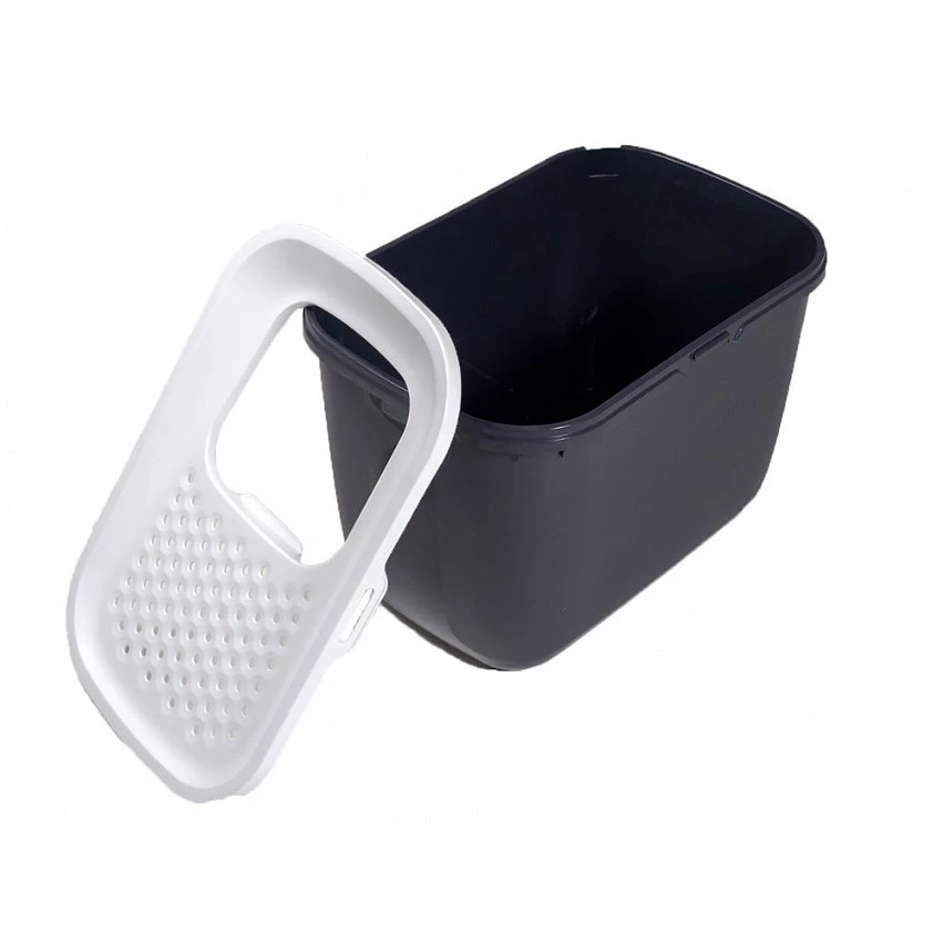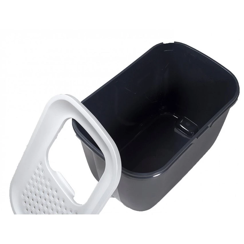 La grande ouverture dans le couvercle permet un accès et une sortie faciles, ce qui rend le Hop In également parfait pour les grands chats. Le nettoyage quotidien du Hop In est une tâche facile. Le couvercle supérieur peut être suspendu pour évacuer les déchets et les poignées intégrées dans la base facilitent le déplacement et le vidage du plateau.