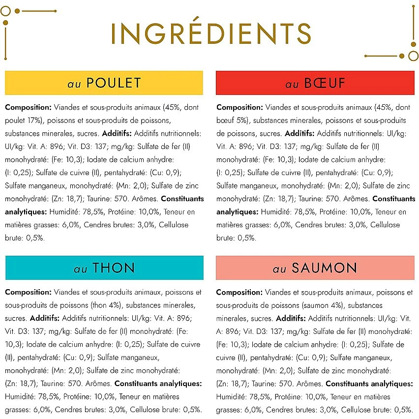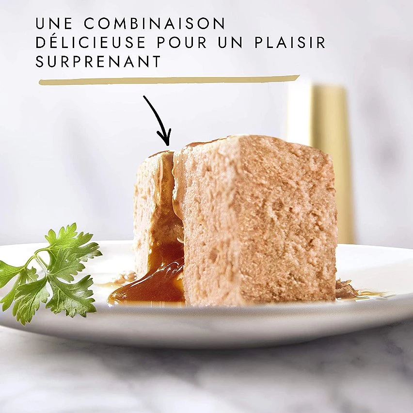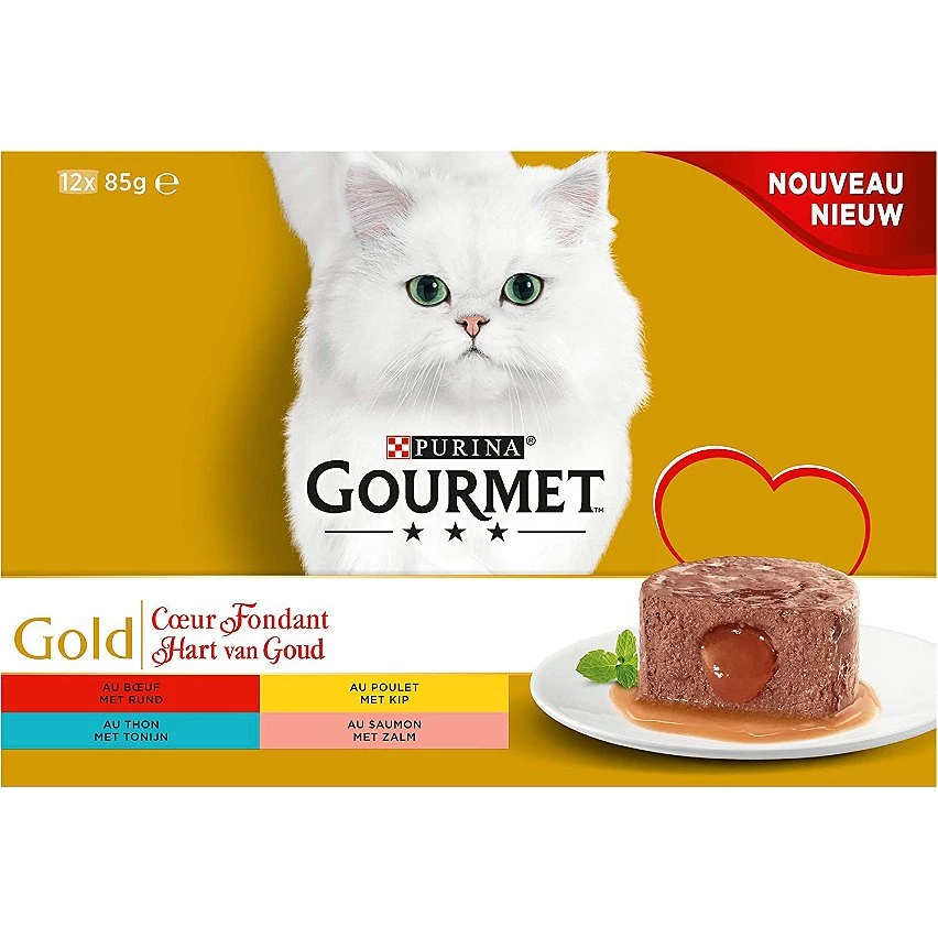 Gourmet CĆur Fondant PĂątĂ©e chat adulte : BĆuf, Poulet, Thon, Saumon – 12x85g. GOURMET GOLD CĆur Fondant est une mousse tendre et irrĂ©sistible au bĆuf, au poulet, au saumon et autres saveurs exquises, avec un cĆur fondant surprenant Ă l’intĂ©rieur..