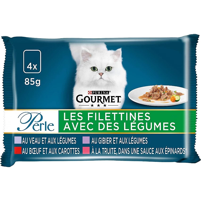 GOURMET Les Filettines Patée pour chat Adulte Veau Gibier Bœuf Truite legumes 4x85g – Pack de 12. Aliment complet pour chat, délicieuses recettes à base de tendres bouchées de viande ou de poisson en sauce, avec tous les nutriments essentiels, en sachets fraîcheur pratiques..