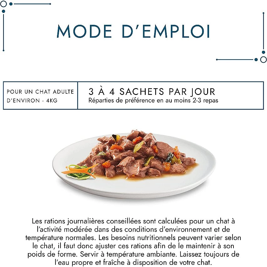 Mode d’emploi : Pour un chat adulte d’environ 4kg, donnez 3 à 4 sachets par jour, répartis de préférence en au moins 2-3 repas. Servir à température ambiante. Laissez toujours de l’eau propre et fraîche à disposition de votre chat.