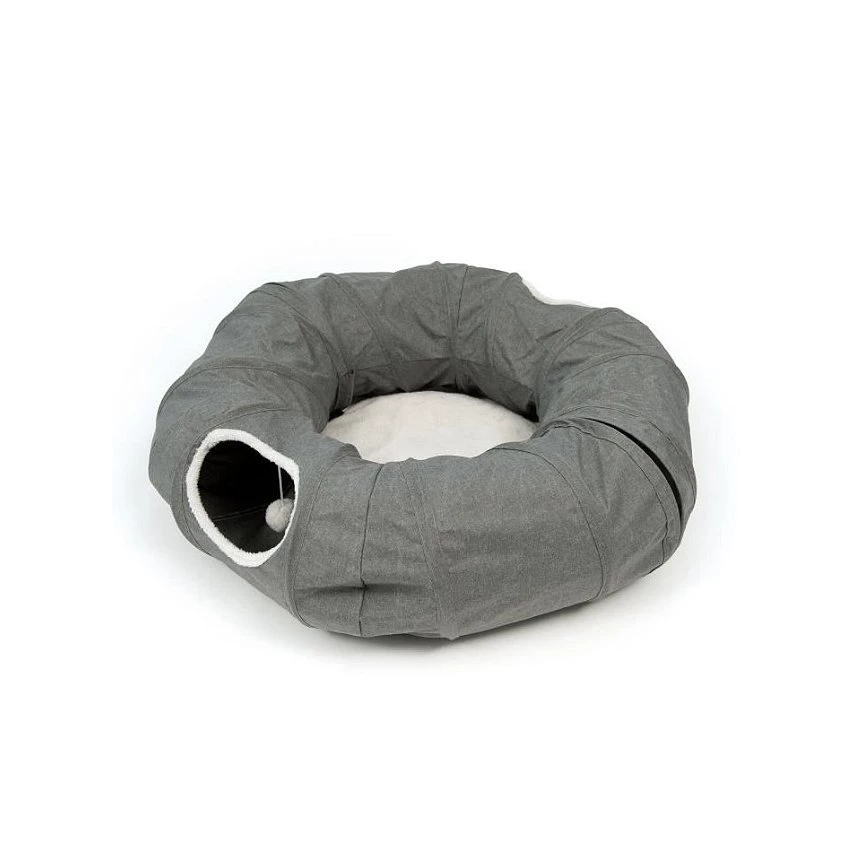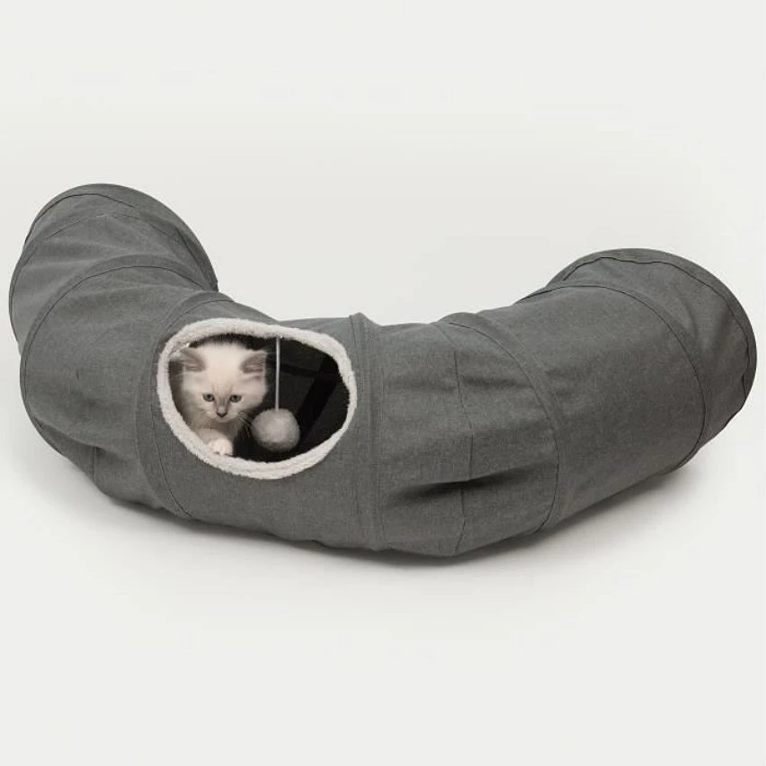 Tunnel de qualité – Tissu de haute qualité – Ouvertures des deux côtés et fenetre d’où pend un pompon – Rangement facile – Coussin a housse amovible facile a nettoyer – Dimensions : L 97 x l 68 x H 28 cm (38,18 x 26,77 x 11 po) – Gris – Pour chat.